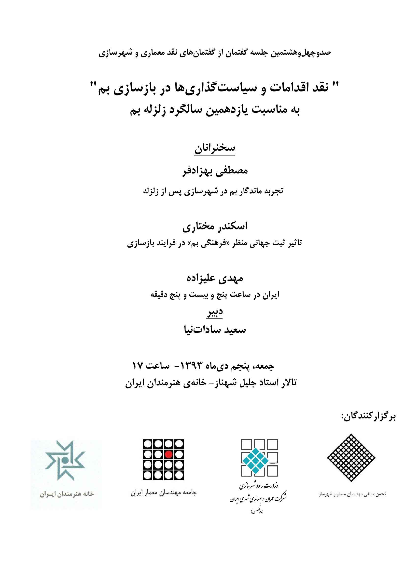 | 15 | معماري ايراني دوران انقلاب اسلامي | سعيد ايزدي، محمد بهشتي، ايرج كلانتري، عليرضا قلي نژاد، شهريار يقيني | 1393/11/20 | 150 |